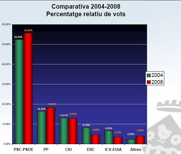 El PSC ha tornat a ser la força més votada a Ripollet, amb un 55,68 % (10.070 vots), el percentatge més alt dels darrers 20 anys. Puja 2,99 punts respecte al 2004, quan ja va assolir el seu rècord històric i incrementa 10,38 punts respecte a l'any 2000. Els socialistes sumen el triple de vots que els populars. Així, el PP obté el 18,26 % (3.302 vots), 1,95 punts més que als passats comicis. El seu líder, Pere Calviño, número 8 a les llistes del PP per Barcelona, no aconsegueix escó de diputat. CiU recull el 12,65 % (2.288 vots), baixa 4 dècimes de fa 4 anys. I finalment, per sota del 5 % trobem: ICV-EUiA (4,58 %), ERC (3,33 %) i Cs (1,32 %).