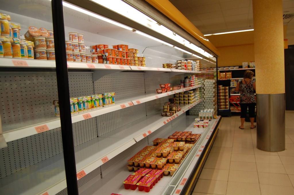 - Un hipermercat local, amb les estanteries buides.