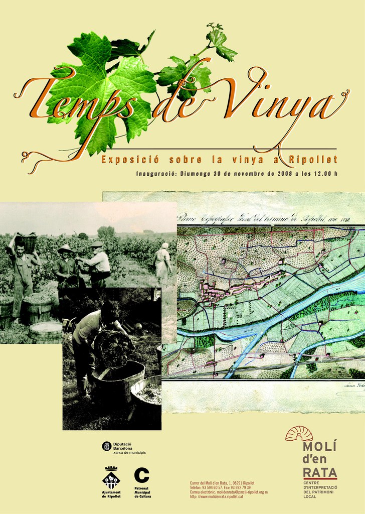 El diumenge 30 de novembre tindrà lloc al Centre d'Interpretació del Patrimoni la inauguració de l'exposició Temps de vinya que repassa la relació de Ripollet amb aquest cultiu i la seva evolució al llarg dels anys. La mostra, produïda pel Patronat Municipal de Cultura de l'Ajuntament de Ripollet, ha estat possible gràcies a l'aportació de material de nombrosos ripolletencs.