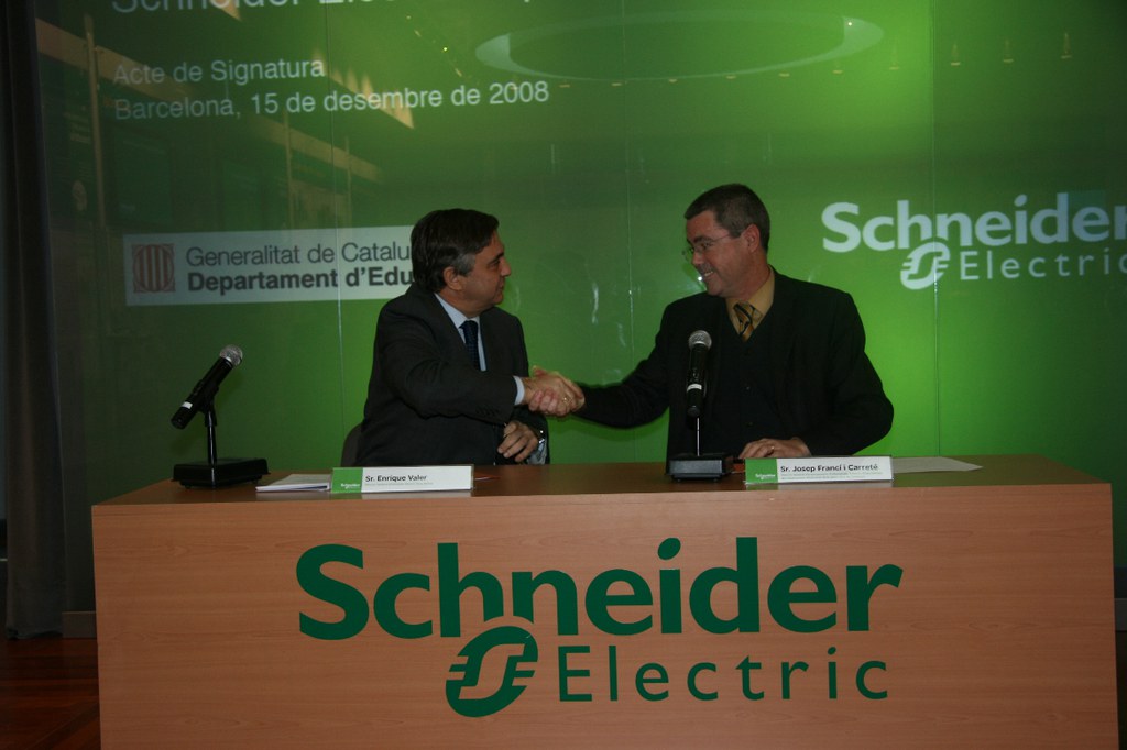 Foto: el director general d'Ensenyaments Professionals, Artístics i Especialitzats, Josep Francí, i el director general d'Schneider Electric España SA, Enrique Valer, durant la signatura.