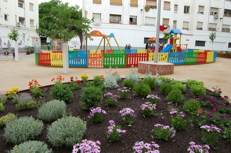 L'actuació ha consistit en anivellar la zona verda, instal·lar un ampli espai de jocs infantils, nou arbrat i uns grans parterres florals. A més, s'han posat bancs i mobiliari urbà reciclat, que ha estat restaurat per la pròpia escola taller. En aquests treballs han participat una desena de persones en atur, que han après treballant els oficis de paleta, fusteria, jardineria, ferreria i instal·lacions.