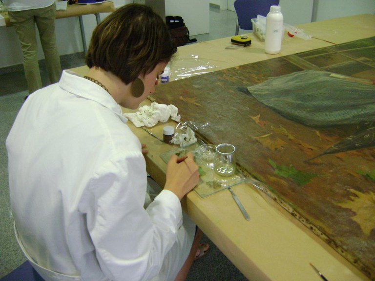 En aquest cas, i mitjançant un conveni entre la Diputació i l'Escola d'Arts i Oficis de Barcelona, restauradors professionals, acompanyats d'un grup d'alumnes en pràctiques de l'especialitat de pintura, es faran càrrec de la restauració de tres olis de Solà que presenten llacunes, descamació o corc a la fusta.