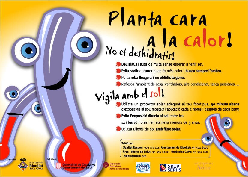 Un any més, durant l'època estival i amb l'arribada de les altes temperatures, l'Ajuntament de Ripollet, a través de la Regidoria de Salut Pública, ha posat en marxa la campanya 'Planta cara a la calor!' 2011. Recordeu que temperatures molt extremes i l'excés de calor poden provocar deshidratació i esgotament, sobretot en persones malaltes, infants i gent gran. Els consells que s'ofereixen a la población són beure aigua i sucs de fruita sense esperar a tenir set, evitar sortir al carrer quan fa més calor i buscar sempre l'ombra, limitar l'activitat física durant les hores de màxima calor, portar roba lleugera i refrescar l'ambient a casa amb ventiladors o aire condicionat.