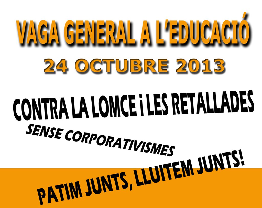 Dijous 24 d'octubre, la Federació de Treballadors de l'Ensenyament així com la UGT i CCOO, han convocat una vaga general de 24 hores als centres educatius per mostrar la seva posició contrària a l'establiment de la Locme i contra les retallades que ha patit el sector. Sota el lema Patim Junts, Lluitem Junts, defensen un ensenyament públic de qualitat i demanen més personal laboral, més escoles concertades i universitats així com més llars d'infants i escoles d'educació especial. Per tal de fer visible aquesta vaga general s'ha convocat una concentració a la plaça Universitat de Barcelona a les 12.30 h. Pel que fa als serveis mínims als centres educatius, la Generalitat ha establert el següent: