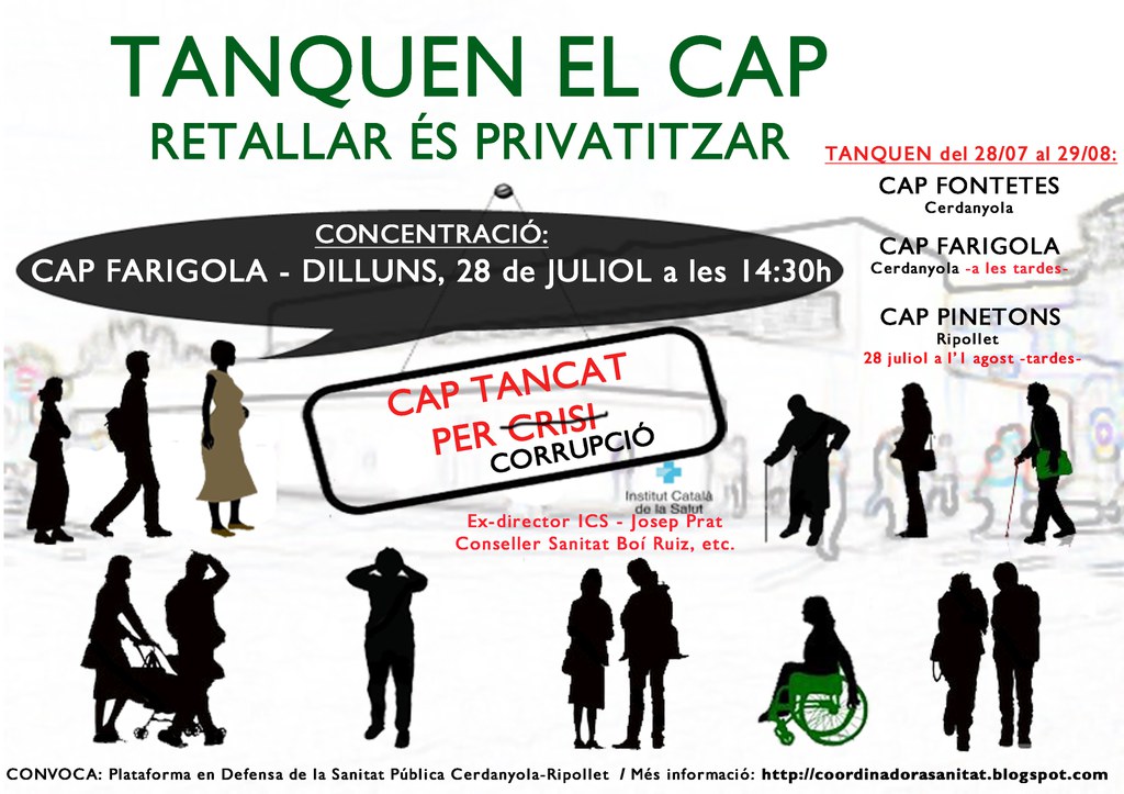 La Plataforma en Defensa de la Sanitat Pública de Cerdanyola-Ripollet ha denunciant públicament les noves retallades que patiran els CAP durant aquest estiu, quant al tancament d'instal·lacions i ha convocat dues concentracions. La primera aquest dilluns 28 de juliol al CAP de la Farigola a les 14.30h i una altra el dia 1 d'agost, davant del CAP Pinetons, també a les 14.30 hores.