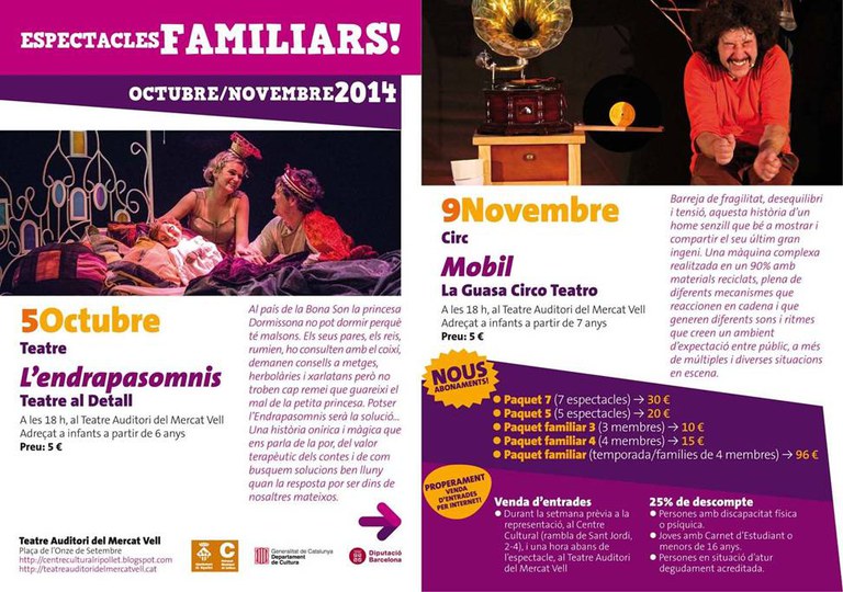 L'espectacle està adreçat a infants a partir de 6 anys i tindrà lloc a les 18 hores, al Teatre Auditori. El preu de l'entrada és de 5 euros, tot i que existeixen diferents paquets d'abonaments. A més, hi ha un 25% de despcompte per a persones amb dicapacitat, joves amb carnet d'estudiant o menors de 16 anys i persones en situació d'atur (consulteu les dades a la segona imatge d'aquesta notícia).