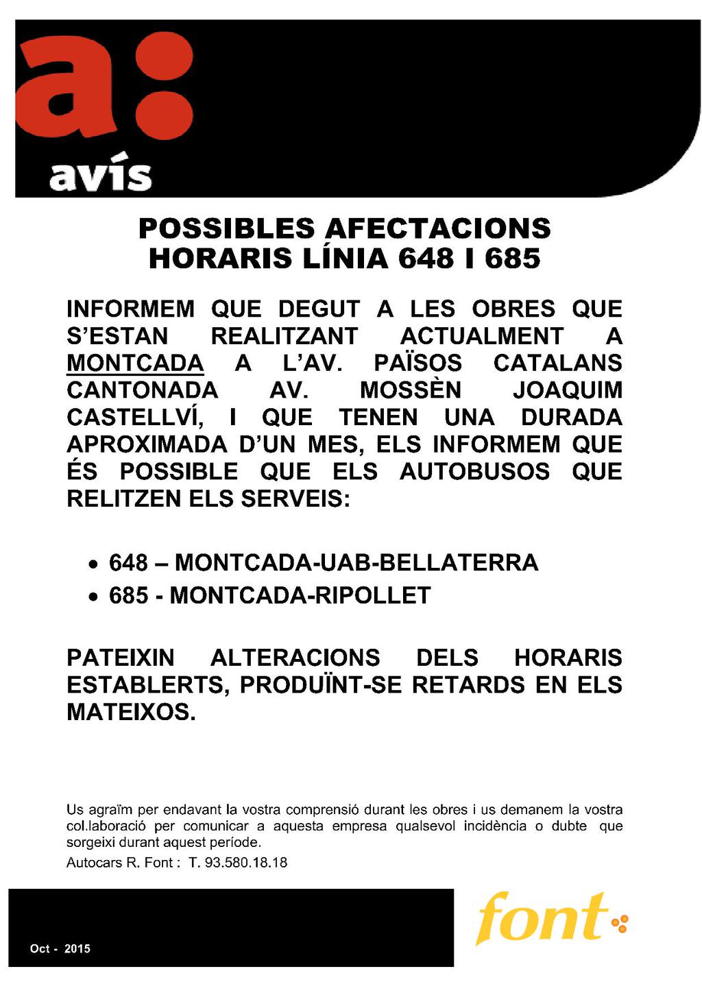 Possibles afectacions horàries a les línies de bus 648 i 685 per obres a Montcada