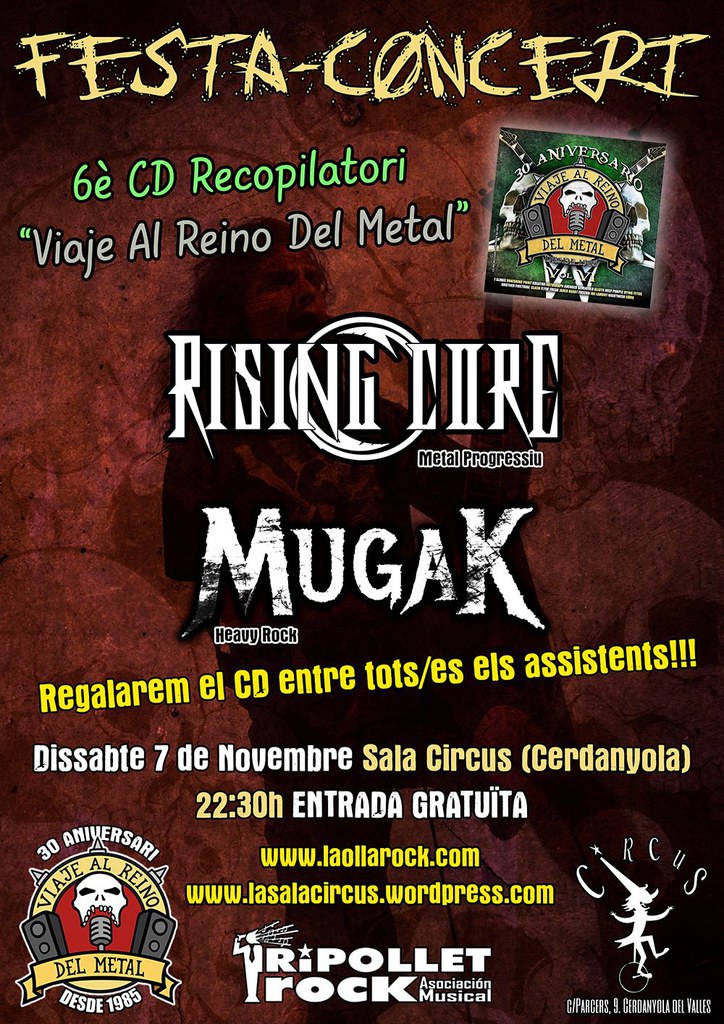 Continuen les activitats amb motiu del 30è aniversari del El programa de rock dur de Ripollet Ràdio, Viaje al Reino del Metal. En aquesta ocasió, s'ha organitzat una festa concert per presentar el 6è CD recopilatori del programa. Tindrà lloc a la Sala Circus de Cerdanyola, el dissabte, 7 de novembre a les 22.30 hores i comptarà amb les actuacions dels joves Mugak, grup amateur de heavy clàssic, amb músics de Ripollet i voltants i la banda de Terrassa de metall progressiu, Rising Core.