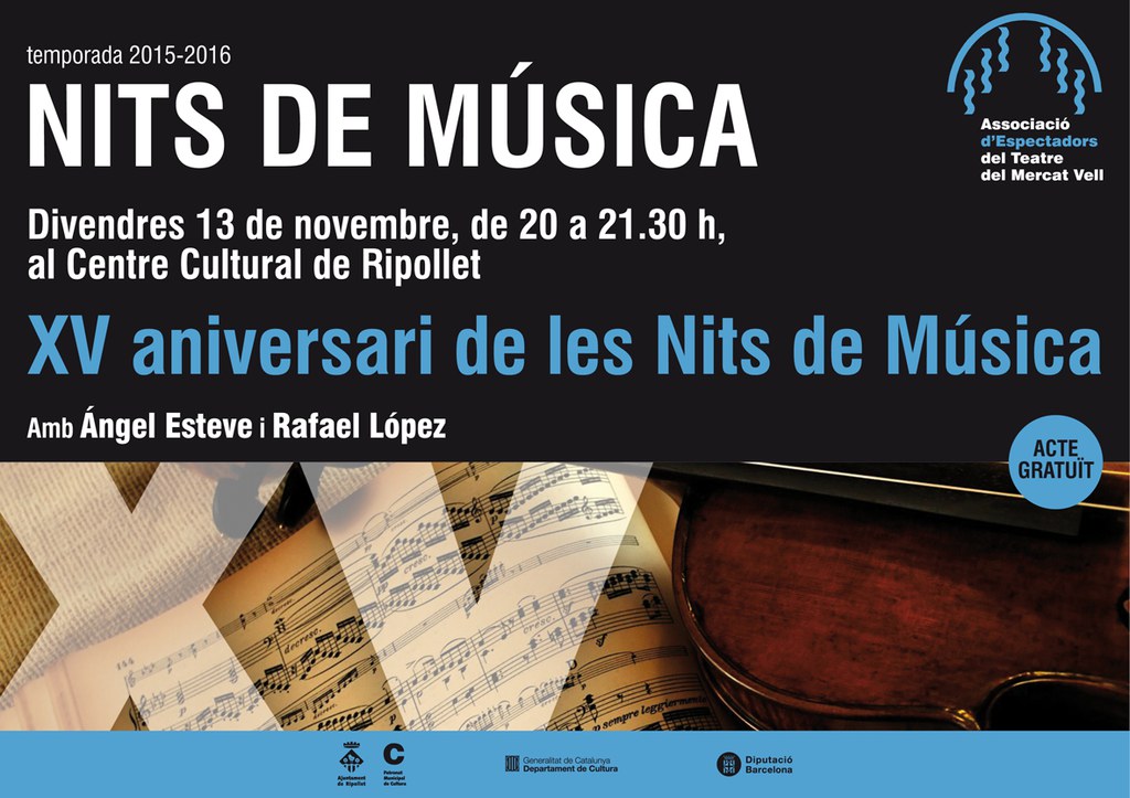 Aquest divendres, 13 de novembre, l'Associació d'Espectadors del Teatre del Mercat Vell celebrarà els 15 anys de la primera sessió de les Nits de Música (que va ser el 30 d'octubre del 2000). La celebració tindrà lloc al Centre Cultural a partir de les vuit del vespre i consistirà en un repàs de les entitats, persones i personatges que han passat al llarg d'aquests 15 anys per l'activitat.