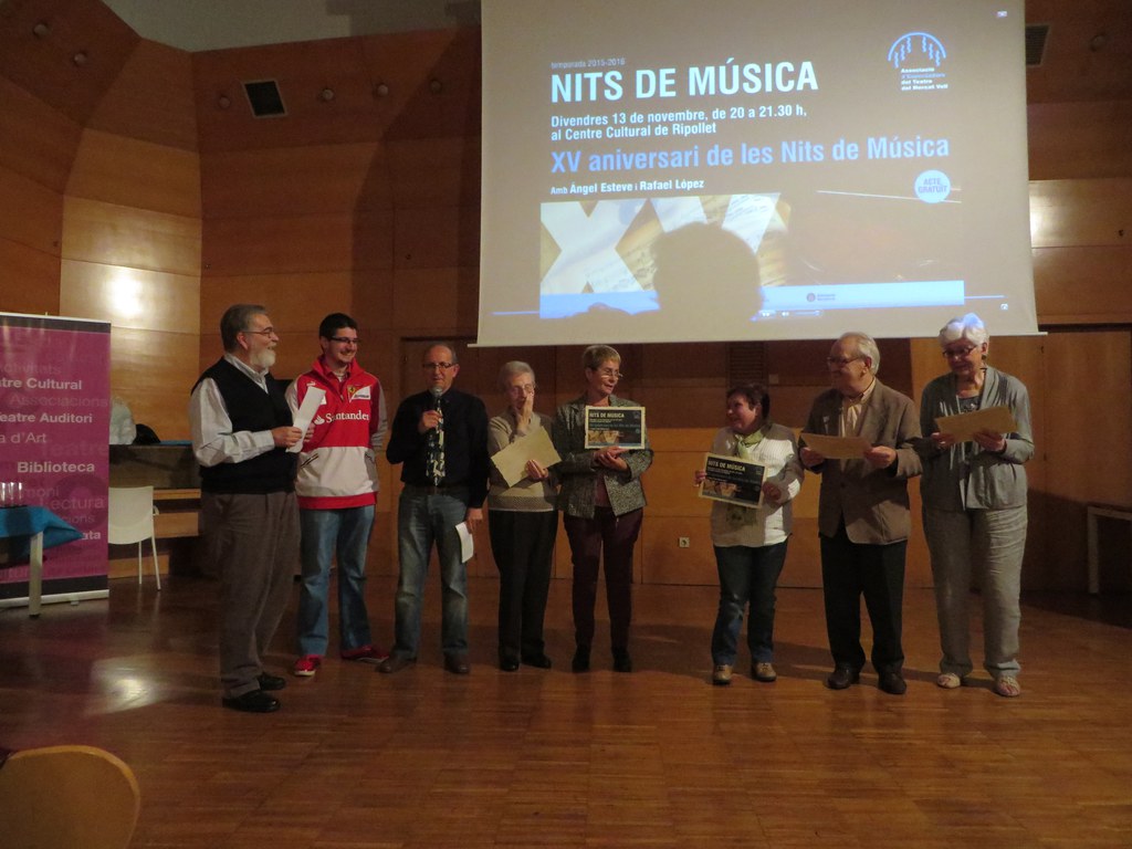 Nits de música va celebrar el passat divendres, 13 de novembre, el seu 15è aniversari amb una emotiva sessió on els seus coordinadors, Ángel Esteve i Rafael López, van voler homenatjar algunes de les persones que van ser-hi a la primera Nits de Música el 22 de novembre de l'any 2.000. Aquella sessió va tenir lloc al local de l'Associació d'Espectadors del Teatre del Mercat Vell i va comptar amb Maria de Lord, María Núñez, Eulàlia Umbert, Wenceslau Soler i Maria Antònia Recasens, els quals també hi eren presents aquest divendres.