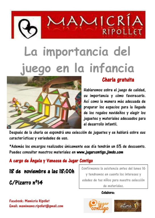 Mamicria Ripollet ha organitzat per al 18 de novembre una xerrada gratuïta sobre la importància del joc en la infància. L'acte, que tindrà lloc a partir de les sis de la tarda al número 14 del carrer de Pizarro, anirà a càrrec d'Ángela i Vanessa, de la botiga de joguines Jugar Contigo.