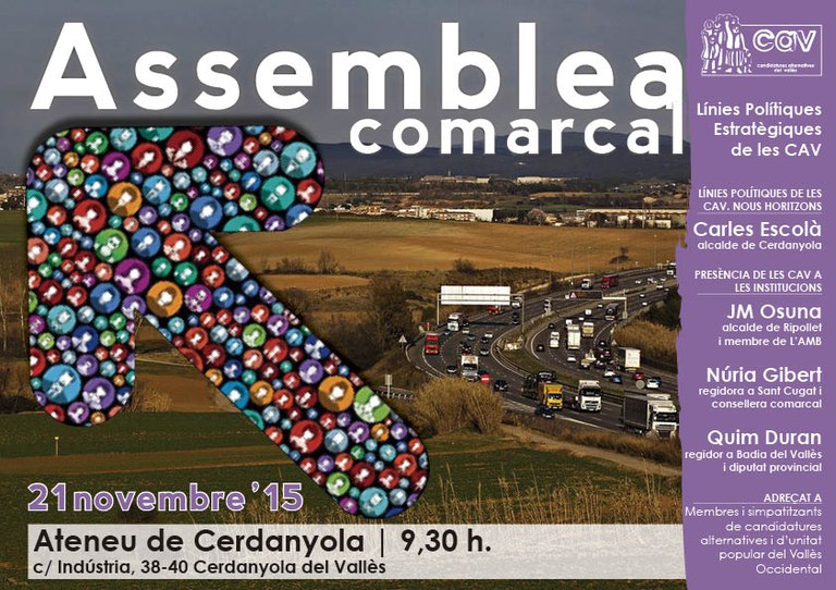 L'assemblea serà inaugurada per l'alcalde de Cerdanyola, Carles Escolà, i també hi participaran altres membres de les CAV amb presència a les institucions, com Núria Gibert (regidora a Sant Cugat del Vallès i consellera comarcal) i Quim Duran (regidor a Badia del Vallès i diputat provincial).