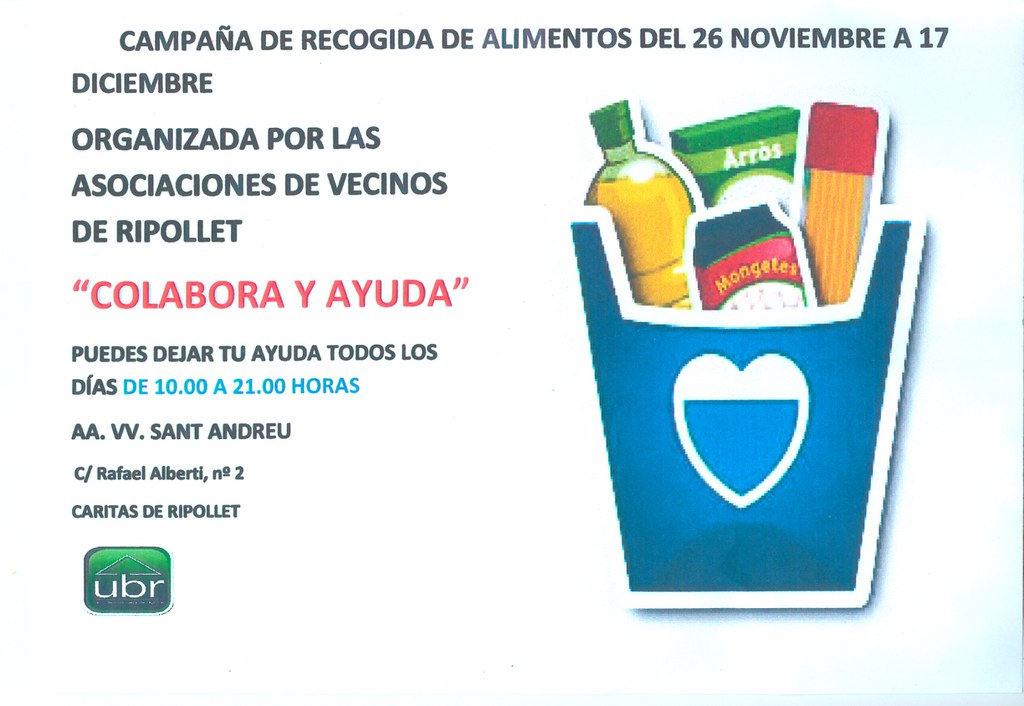 Sota el lema 'Col·labora i ajuda', les associacions de veïns de Ripollet duen a terme una campanya de recollida d'aliments que compta amb el suport de la Unió de Botiguers de Ripollet (UBR). Les donacions es poden aportar a les seus de totes les entitats veïnals, fins al 17 de desembre, de 10 a 21 hores. Aquestes es faran a arribar a Càritas.