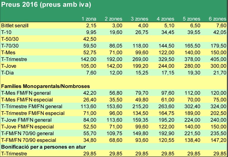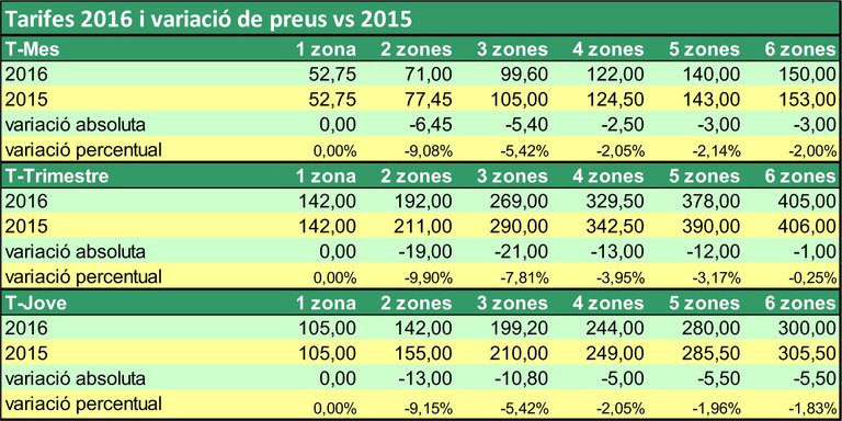 L'Autoritat del Transport Metropolità va aprovar fa una setmana les noves tarifes per als títols del transport públic d'aquest pròxim any 2016. En general, cap bitllet de transport incrementa el seu preu. A més, es rebaixen alguns abonaments, com ara com el de la T-Mes, la T-Trimestre i la T-Jove, entre 2 i 6 zones, i s'amplia fins als 14 anys la cobertura gratuïta de la T-12.