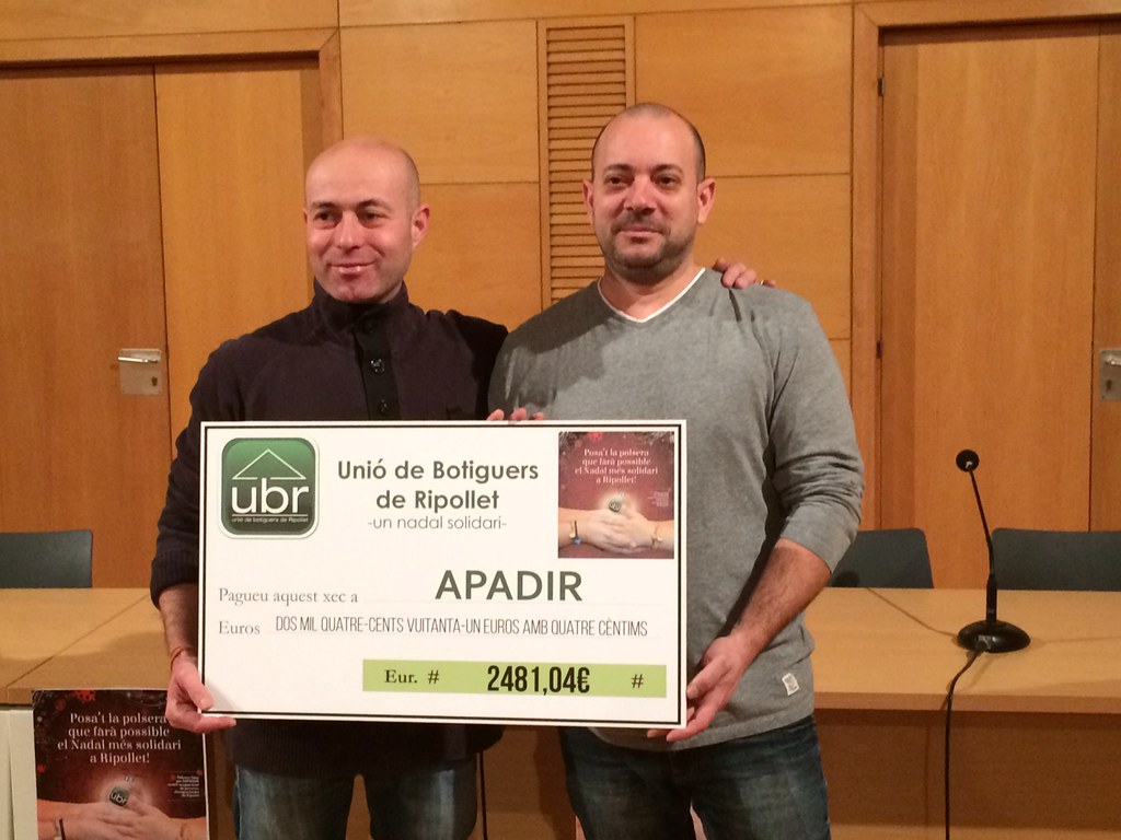 La Unió de Botiguers de Ripollet (UBR) va entregar dissabte, 23 de gener, els diners recaptats durant la campanya de venda de polseres solidàries. Finalment, s'han recaptat un total de 2.481,04 euros que s'han entregat a l'entitat Apadir per a desenvolupar els seus projectes.
