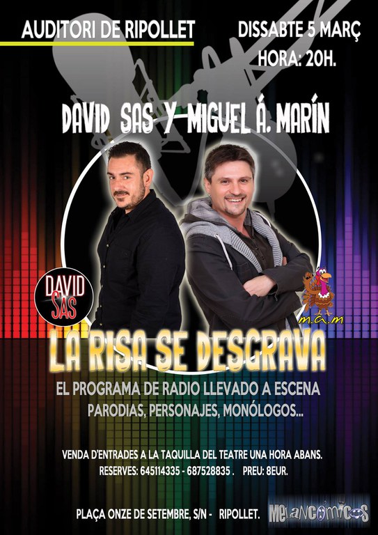Aquest dissabte, 5 de març, tindrà lloc l'espectacle La risa se desgrava, que començarà a les 20 hores. L'obra es basa en el programa radiofònic emès per internet a radiosantboi.cat, presentat per David Sas i Miguel Á. Marín, que ara ha estat portat a escena i que inclou paròdies, personatges i monòlegs.