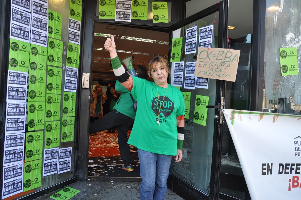 Es tracta d'una acció indefinida, en la qual ocuparan aquestes dependències del banc o en altres municipis fins que es trobi una solució a la situació concreta de la María Ángeles, veïna de Ripollet. La M. Ángeles va comprar un pis fa 13 anys amb la seva parella amb una hipoteca de 140.000 euros. Uns anys més tard, va ficar-se en una altra hipoteca amb el seu fill per a comprar el seu pis i el va avalar amb una càrrega de 50.000 euros en la hipoteca del seu anterior pis. La mort del seu marit va deixar la María Ángeles en una situació financera molt delicada. Va realitzar la reunificació de prèstecs, i una de les hipoteques va passar a ser responsabilitat de l'empresa Blaston. Malgrat la dificultat de la situació, després de negociar dos anys amb Blaston, ha aconseguit la dació en pagament del pis del seu fill, que ara viu amb ella. A més, Blaston ha condonat el deute de 50.000 euros que va contraure com a aval en la seva primera hipoteca.