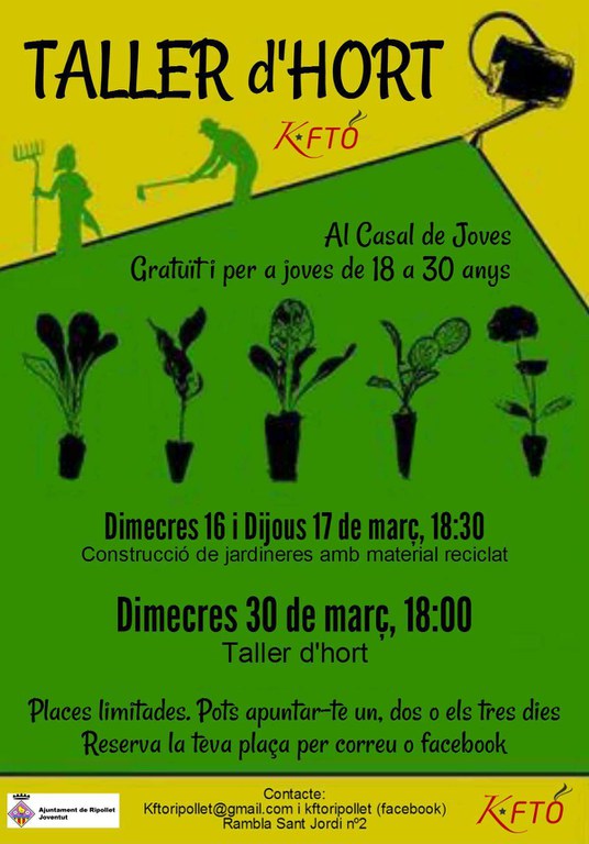 Aquest dimecres, 16 de març, comença un Taller d'Hort que constarà de tres sessions. Es tracta d'un curs gratuït, que es durà a terme en el Casal de Joves i que està adreçat a persones de 18 a 30 anys. Les places són limitades i els interessats es poden inscriure a només una sessió, a dues o a totes tres. Per rebre més informació, cal escriure al correu kftoripollet@gmail.com o a través de Facebook.