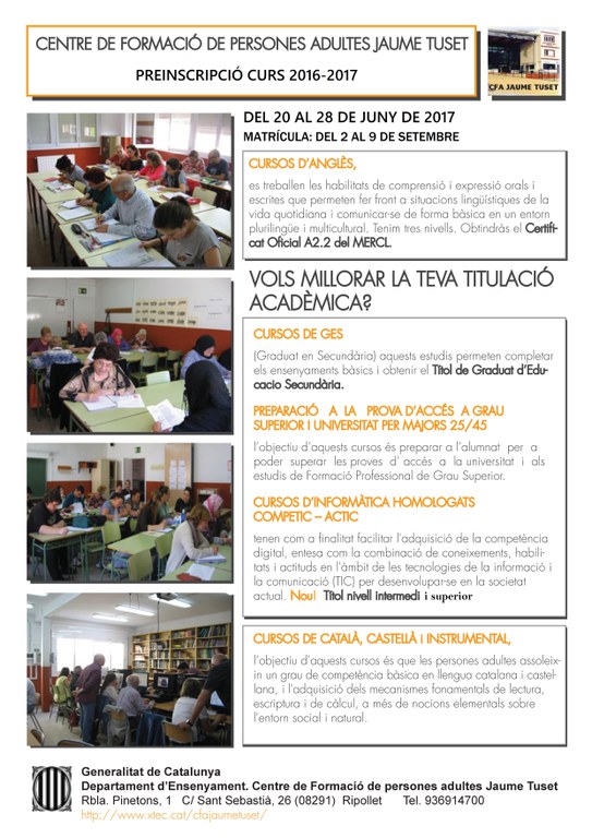 El Centre de Formació d'Adults Jaume Tuset obre aquest dilluns, 20 de juny, el període de preinscripció per al curs vinent. El termini finalitza el 28 de juny. La matrícula dels alumnes admesos, però, tindrà lloc del 2 al 9 de setembre. La dels tallers també serà al setembre.