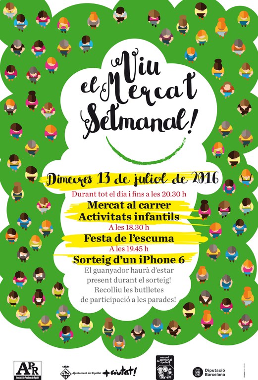 El mercat setmanal organitza dimecres, 13 de juliol, un conjunt d'activitats sota el nom de 'Viu el Mercat Setmanal!'. L'Associació de Paradistes de Ripollet realitza diverses d'activitats que duraran tot el dia. La celebració comença al matí amb el mercat setmanal habitual de cada dimecres, que comptarà amb activitats infantils. La jornada continuarà a la tarda amb un mercat al carrer, una festa de l'escuma a les 18.30 h i el sorteig d'un iPhone 6 a les 19.45 h, del qual es poden adquirir les butlletes a les parades del mercat.