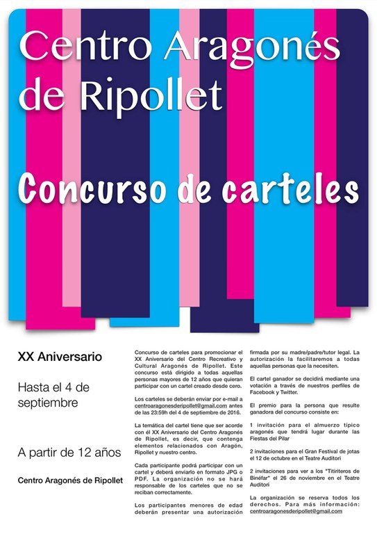 El concurs està adreçat a qualsevol persona major de 12 anys (si s'és menor, s'ha de presentar una autorització del seu tutor). La temàtica del cartell ha d'incloure elements relacionats amb Aragó, Ripollet i el mateix Centro Aragonés. A més, ha d'incloure les frases "Centro Aragonés de Ripollet", "XX aniversario" i "25, 26 y 27 de noviembre de 2016". El disseny s'ha d'enviar en format jpg o pdf, i el guanyador s'escollirà a través d'una votació popular al Facebook i Twitter de l'entitat.
