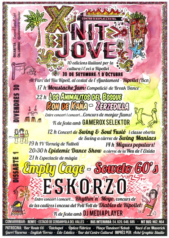 Avui divendres, 30 de setembre, comença la desena edició de la Nit Jove que organitza el Centre d'Esplai l'Estel. L'activitat, que s'allargarà també al dissabte, 1 d'octubre, tindrà com a escenari el parc del Riu Ripoll. Aquest any hi haurà concerts de grups prou coneguts com Eskorzo o Soweto, a més de l'actuació de formacions locals com els Animalitos del Bosque, Ron de Caña i Zerzedilla. També hi haurà classes de swing, una competició de breakdance i es recupera el concurs de menjar flam. En la secció de l'Agenda es troba la programació completa.