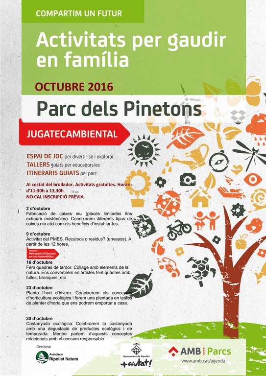 La Jugatecambiental presenta aquest diumenge 9 d'octubre una activitat dins del Programa Metropolità d'Educació per a la Sostenibilitat. Es tracta del taller Recursos o residus? (envasos). Com sempre, l'activitat començarà a les 11.30 hores, i es durà a terme al brollador del parc dels Pinetons. És gratuïta i no requereix inscripció prèvia.