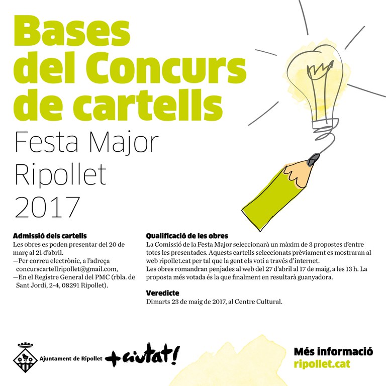 El pròxim 21 d'abril, divendres de la setmana vinent, acaba el termini per enviar les propostes al Concurs de Cartells de Festa Major. Tal com va passar l'any passat, el Patronat Municipal de Cultura (PMC) ha inclòs en les bases del concurs una votació popular per escollir el cartell guanyador. El tema del cartell és lliure, però s'ha d'adequar a l'anunci de la Festa Major. Per tant, els dissenys han d'incloure la llegenda següent: "Festa Major de Ripollet. 25, 26, 27 i 28 d'agost de 2017".