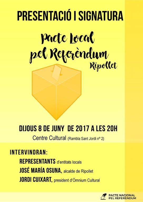 Aquest dijous, 8 de juny, es presenta el Pacte Local pel Referèndum a Ripollet en un acte central que tindrà lloc al Centre Cultural, a partir de les 20 hores. La presentació del Pacte Local pel Referèndum comptarà amb la presència de l'alcalde de Ripollet, José M. Osuna, i el president d'Òmnium Cultural, Jordi Cuixart. Després de la lectura del manifest del Pacte Local pel Referèndum, es procedirà a l'acte solemne de signatura a càrrec de les entitats que s'hi han adherit.