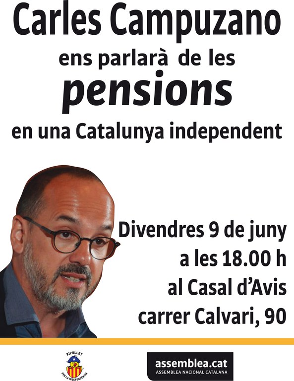 A més de la presentació del Pacte Local pel Referèndum, Ripollet per la Independència ha organitzat aquest divendres, 9 de juny, una xerrada amb el llicenciat en dret Carles Campuzano al Casal d'Avis (c. del Calvari, 90). La xerrada s'iniciarà a les 18 hores. Sota el títol Les pensions en una Catalunya independent, Campuzano parlarà als assistents sobre el futur de les pensions i altres qüestions relacionades.