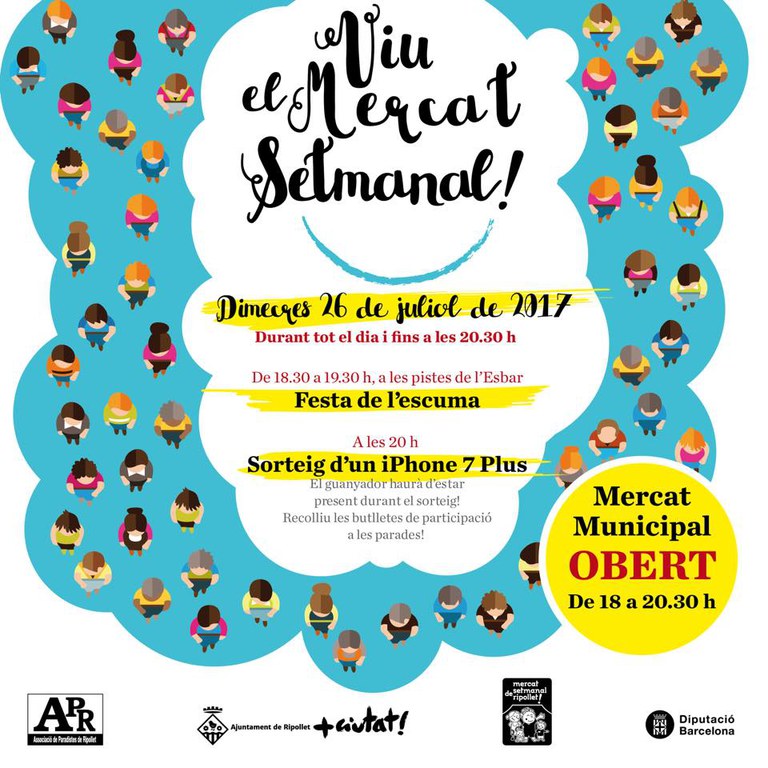 El mercat setmanal ha organitzat aquest dimecres, 26 de juliol, una nova edició de 'Viu el Mercat Setmanal!'. L'Associació de Paradistes de Ripollet, amb la col·laboració de l'Ajuntament de Ripollet i la Diputació de Barcelona oferirà una jornada de compres en família durant tot el dia i fins les 20.30 h. A més, a les 18.30 h celebraran una festa de l'escuma a les pistes de l'Esbar i a les 20 h realitzaran el sorteig d'un mòbil d'última generació. Com a novetat, el Mercat Municipal obrirà aquest dimecres, de 18 a 20.30 h.