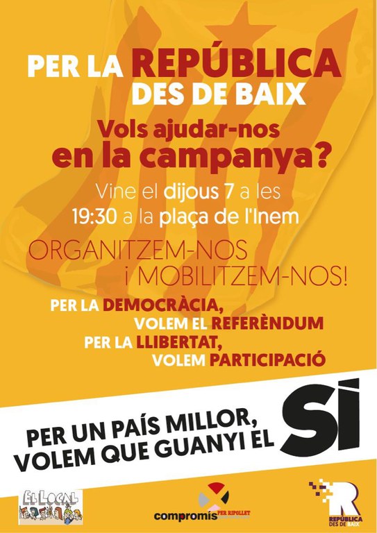 Compromís per Ripollet fa una crida a tota la gent que vulgui col·laborar en fer la campanya pel Sí de la CUP i de República des de Baix en el referèndum sobre la independència de Catalunya convocat per a l'1 d'octubre. Les persones interessades en col·laborar en la campanya han d'adreçar-se a la coneguda com a plaça de l'Inem, a la rambla de Sant Jordi, dijous a les 19.30 h.