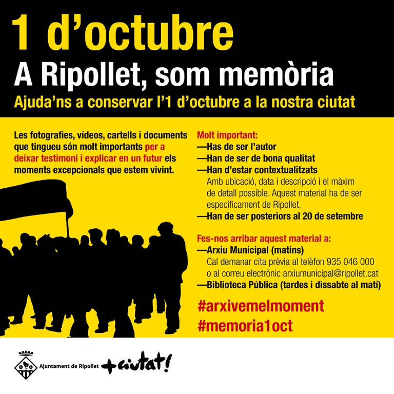 Des de la Regidoria de Patrimoni i Memòria Històrica, promotora d'aquesta adhesió, es demana que es tracti de documents, fotos, vídeos o àudios que facin referència a actes o fets esdevinguts a Ripollet a partir del passat 20 de setembre i que es detalli la data, la ubicació i la descripció del fet per tal de facilitar la classificació dels documents aportats.