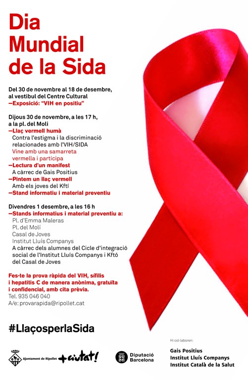 Aquest 1 de desembre es celebra el Dia Mundial de la Sida. Per aquest motiu, amb el treball transversal de les regidories de Joventut, Polítiques LGTBI, Educació i Salut Pública, s'ha organitzat un seguit d'activitats a partir del dia 30 de novembre. Aquestes activitats compten amb la col·laboració de Gais Positius, el personal sanitari dels centres d'atenció primària de Ripollet i els cicles formatius de l'institut Lluís Companys.