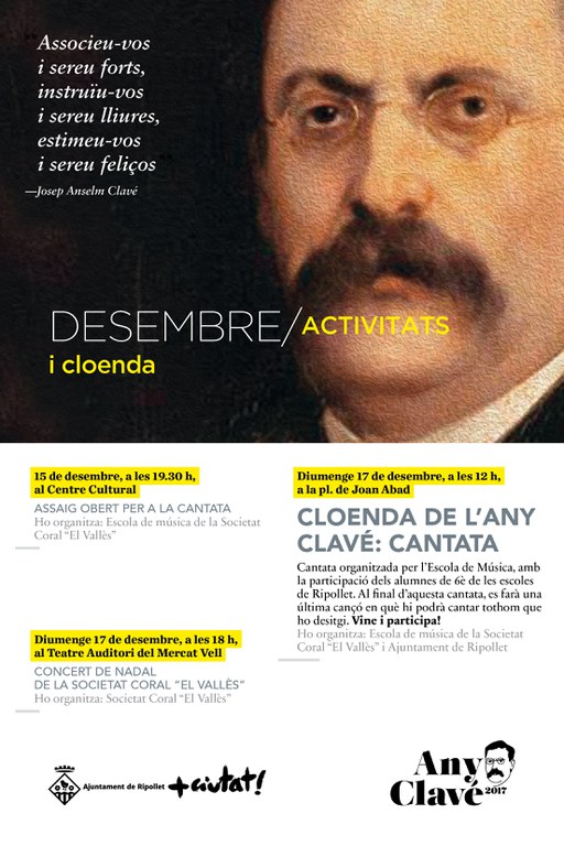 Durant aquest any 2017, Ripollet ha celebrat multitud d'activitats per a commemorar l'Any Clavé. Un any que arriba a la seva fi amb l'acte de cloenda organitzat pel proper diumenge, 17 de desembre, a la plaça de Joan Abad.
