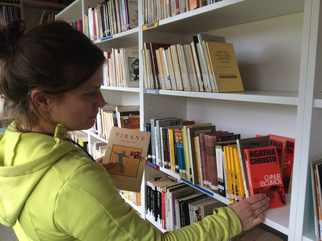 (Foto: Vanessa Rodríguez, coordinadora de la biblioteca de l'Institut Lluís Companys, posant a punt la biblioteca)