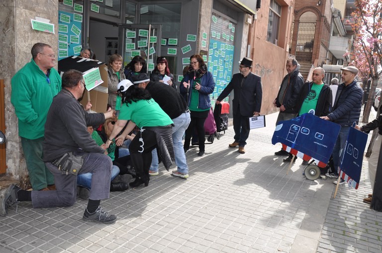La Plataforma d'Afectats per la Hipoteca Ripollet-Cerdanyola s'enfronta aquesta setmana al desnonament de les famílies de David i Sonia, amb dos menors cadascun. Donat que els dos habitatges són propietat de Bankia, que s'ha negat a suspendre el desnonament, aquest matí la PAH s'ha mobilitzat a la seu que l'entitat bancària té a la rambla de Sant Jordi. Es tracta de dos casos que han passat per la Taula d'emergència en l'àmbit de l'habitatge de la Generalitat i resten a l'espera de l'adjudicació d'un habitatge, que no arriba. Durant la protesta, afectats i activistes de la PAH han representat un desnonament.