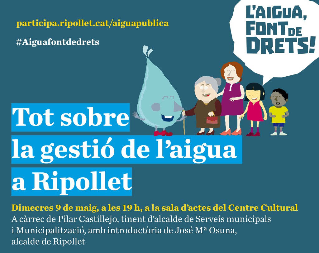 Aquest dimecres, 9 de maig, la tinenta d'alcalde de l'Ajuntament de Ripollet, Pilar Castillejo, presentarà la proposta de gestió del servei d'abastament d'aigua sorgida des de la Comissió Municipal de l'Aigua. Aquest ens està constituït per representants de tots els grups municipals amb presència a l'Ajuntament i entitats socials del municipi. La xerrada, titulada "Tot sobre la gestió de l'aigua Ripollet, és oberta a tota la ciutadania i comptarà amb la introducció de l'alcalde, José M. Osuna. Tindrà lloc a la Sala d'Actes del Centre Cultural, a les 19 h.