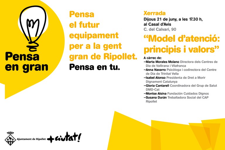 Continuant amb el procés participatiu "Pensa en gran", per tal de pensar en el futur equipament per a la gent gran de Ripollet, s'oferirà una xerrada aquest dijous, 21 de juny, a les 17.30 h, al Casal d'Avis (c. del Calvari), sota el títol "Model d'atenció: principis i valors".