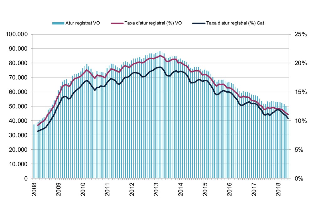 Imatge: Evolució de la població desocupada i la taxa d'atur registrat. Gener 2008- juny 2018. Vallès Occidental