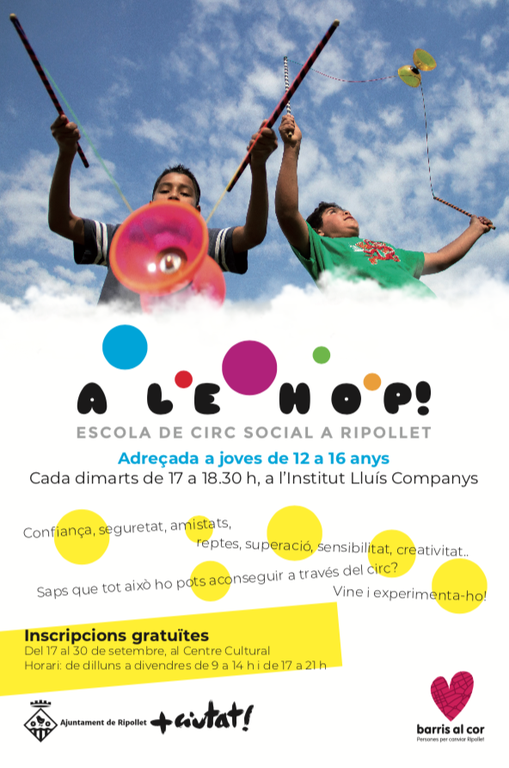 L'escola de circ social a Ripollet, Alehop! obre el període d'inscripcions aquest dilluns 17 de setembre. Per formalitzar la inscripció, cal adreçar-se al Centre Cultural, de dilluns a divendres, de 9 a 14 h i de 17 a 21 h, fins al 30 de setembre.