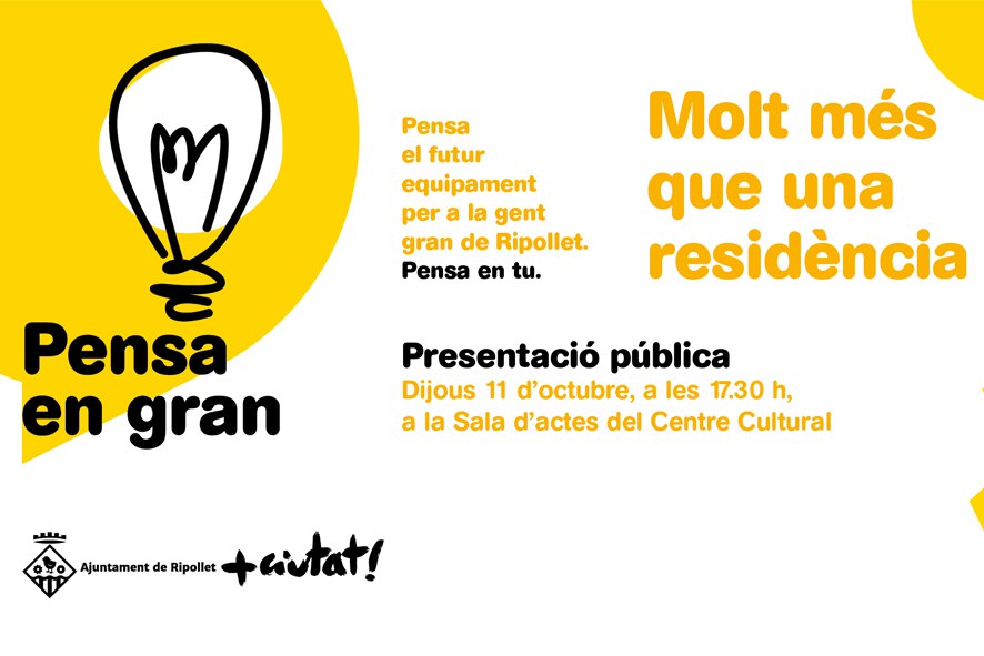 Aquesta tarda, a les 17.30h, es presentarà el projecte participatiu 'Pensa en gran' a la Sala d'Actes del Centre Cultural. El procés, que es va dur a terme de maig a juliol passat, ha conclogut que Ripollet necessita un nou equipament per a la gent gran d'almenys 132 places de residència públiques concertades (ràtio de 2,32 places per cada 100 habitants), així com una ampliació de l'oferta del Centre de Dia, que actualment compta amb 38 places concertades i una llista d'espera de 50 persones.