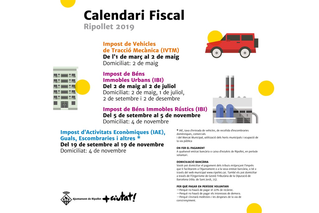 El passat 1 de març va començar el termini per al primer dels pagaments del Calendari fiscal de Ripollet 2019, corresponent a l'Impost de Vehicles de Tracció Mecànica (IVTM), que s'allargarà fins al 2 de maig. Entre maig i juliol s'haurà de fer el pagament de l'Impost de Béns Immobles Urbans (IBI) i el darrer trimestre de l'any serà el torn de l'Impost de Béns Immobles Rústics i de l'Impost d'Activitats Econòmiques (IAE), Guals i Escombraries.
