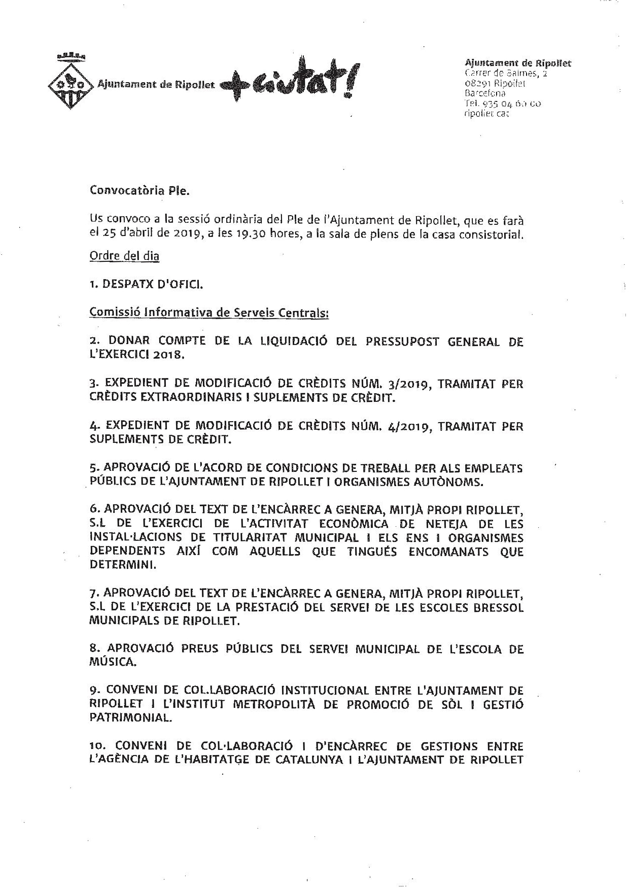 Avanç del Ple Ordinari del 25 d'abril del 2019
