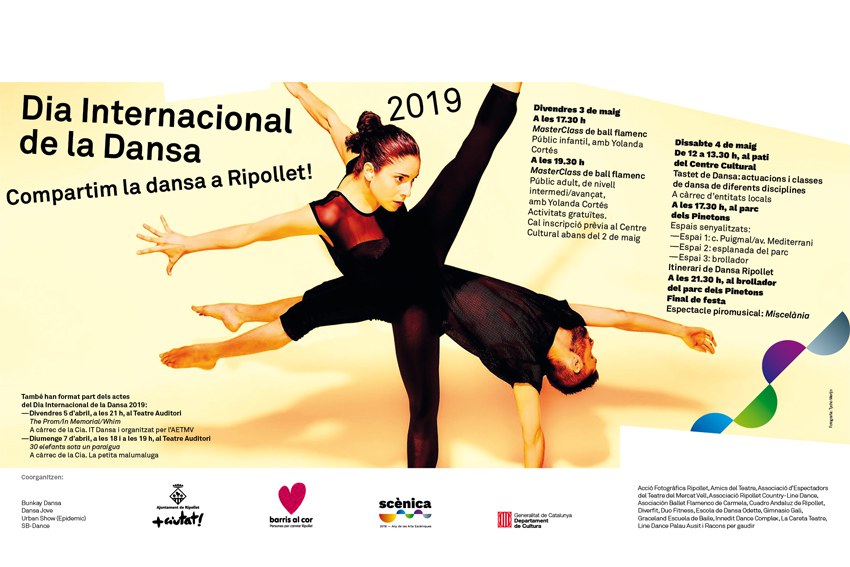 El Dia Internacional de la Dansa 2019 està inclòs dins de l'AnyScènica i coorganitzat pels patronats de Cultura i Esports, Dansa Jove, Urban Show (Epidemic), SB Dance i Bunkay Dansa, a més de comptar amb la col·laboració d'una quinzena de col·lectius. El DID és una festa on compartir la passió per la dansa en tota la seva diversitat i una ocasió per a acostar-la a la ciutadania. Enguany, pren especial rellevància, en ser una de les activitats destacades de l'Any de les Arts Escèniques 2019, amb un programa on la dansa es barreja amb la música i el foc, sobre nous espais escènics, buscats per a l'ocasió.
