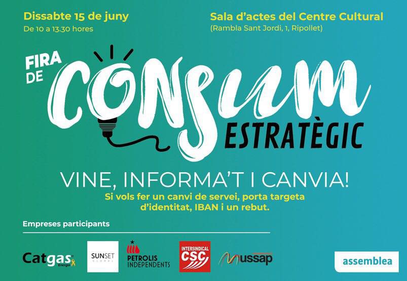 El dissabte, 15 de juny, de 10 a 13.30 h, l'ANC de Ripollet celebrarà a la Sala d'actes del Centre Cultural la Fira de Consum Estratègic, una jornada informativa que també ofereix la possibilitat de canviar de serveis i que, de moment, comptarà amb la presència d'empreses com Catgas, Sunset, Petrolis Independents, Intersindical CSC i Ussap.