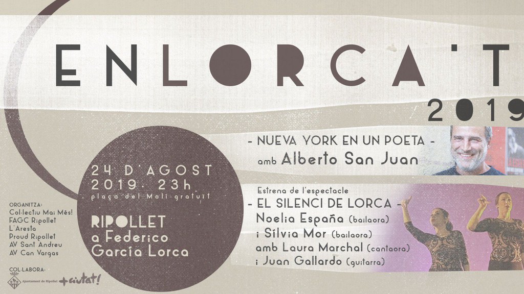 L'Enlorca't torna a Ripollet dins dels marc dels actes de la Festa Major 2019. El reconeixement al poeta i víctima del feixisme inclou dos espectacles, un d'ells d'estrena, que giren al voltant de la seva obra i de la seva personalitat. El primer es tracta de l'espectacle 'Nueva York en un poeta', del reconegut autor Alberto San Juan, sobre el viatge i l'estada de Lorca a Nova York el juny de 1929. Allà va ser testimoni del Crack del 29,que va desembocar en el llibre 'Poeta en Nueva York' el 1930.