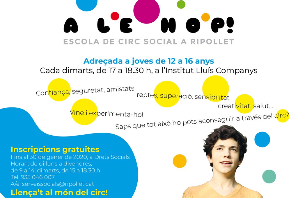 Les inscripcions per a l'escola de circ social Alehop! es mantenen obertes fins al 31 de gener. Les persones interessades han de dirigir-se a Drets Socials, de dilluns a divendres, de 9 a 14 h i els dimarts de 15 a 18.30 h; al telèfon 935 046 007, o al correu electrònic serveissocials@ripollet.cat).