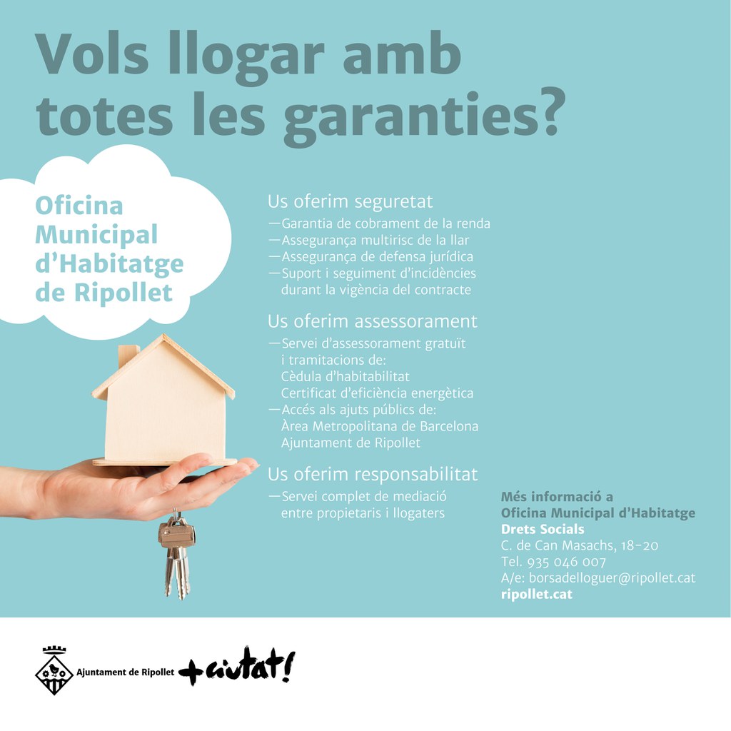 Les persones interessades han de posar-se en contacte amb l'Oficina Municipal d'Habitatge, a les oficines de Drets Socials (c. de Can Masachs 18-20, tel. 935 046 007, borsadelloguer@ripollet.cat).