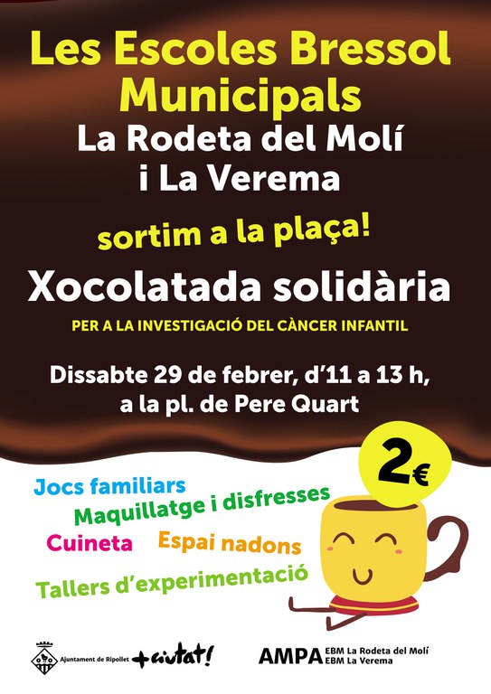 Les Escoles Bressol Municipals La Rodeta del Molí i La Verema, amb el suport de les seves respectives Associacions de Mares i Pares d'Alumnes, volen sortir al carrer i apropar a la ciutadania el seu projecte educatiu. Per fer-ho, el pròxim dissabte, 29 de febrer, d'11 a 13 h, han organitzat una jornada festiva, amb diferents espais, tallers i jocs, que inclourà una xocolatada solidària per a la investigació del càncer infantil.